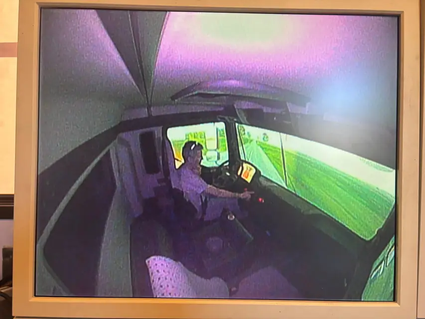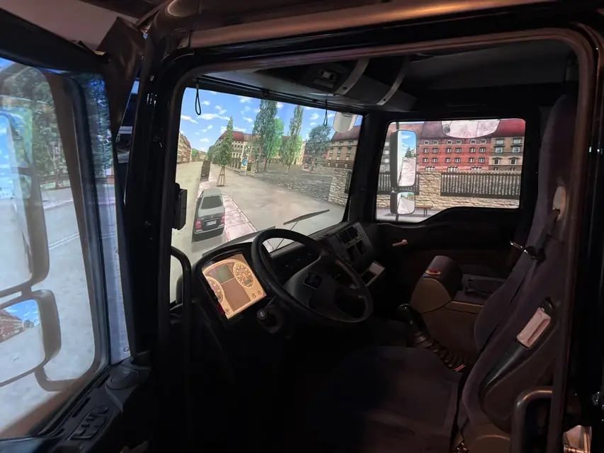 Anschließend ging es zur Praxis – und die hatte es in sich. Der Simulator befand sich in einem LKW-Auflieger und bestand aus einer voll funktionsfähigen MAN-Führerkabine, die ein äußerst realistisches Fahrgefühl vermittelte. Nach einer kurzen Eingewöhnungsphase, in der man sich mit der Technik vertraut machen konnte, begann das eigentliche Szenario: Blaulicht an, Sirene ein – Einsatzfahrt!