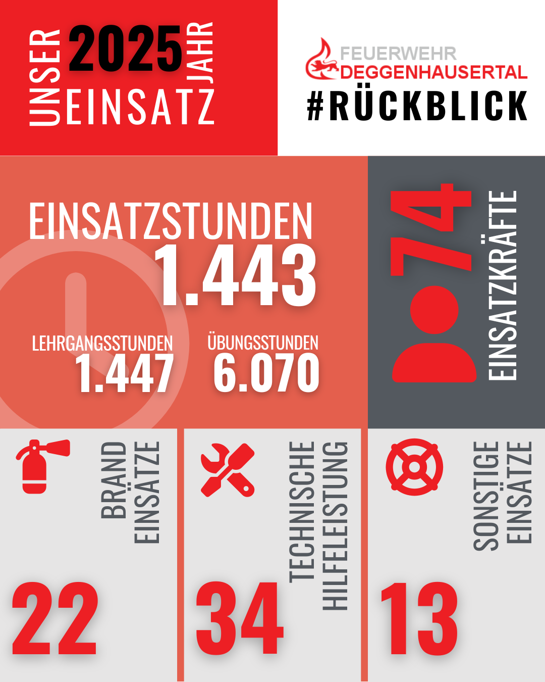 Nach dem Totengedenken an die verstorbenen Kameraden Friedrich Höss und Gebhard Megger folgten die Berichte des vergangenen Jahres. Schriftführer, Jugendfeuerwehr, Altersabteilung und Kommandant blickten auf ein ereignisreiches Jahr zurück. Die Feuerwehr Deggenhausertal rückte zu 69 Einsätzen aus und leistete dabei über 1.400 Einsatzstunden. Hinzu kamen zahlreiche Übungen, Ausbildungen und Lehrgänge, die die Einsatzbereitschaft der Wehr sicherstellen.