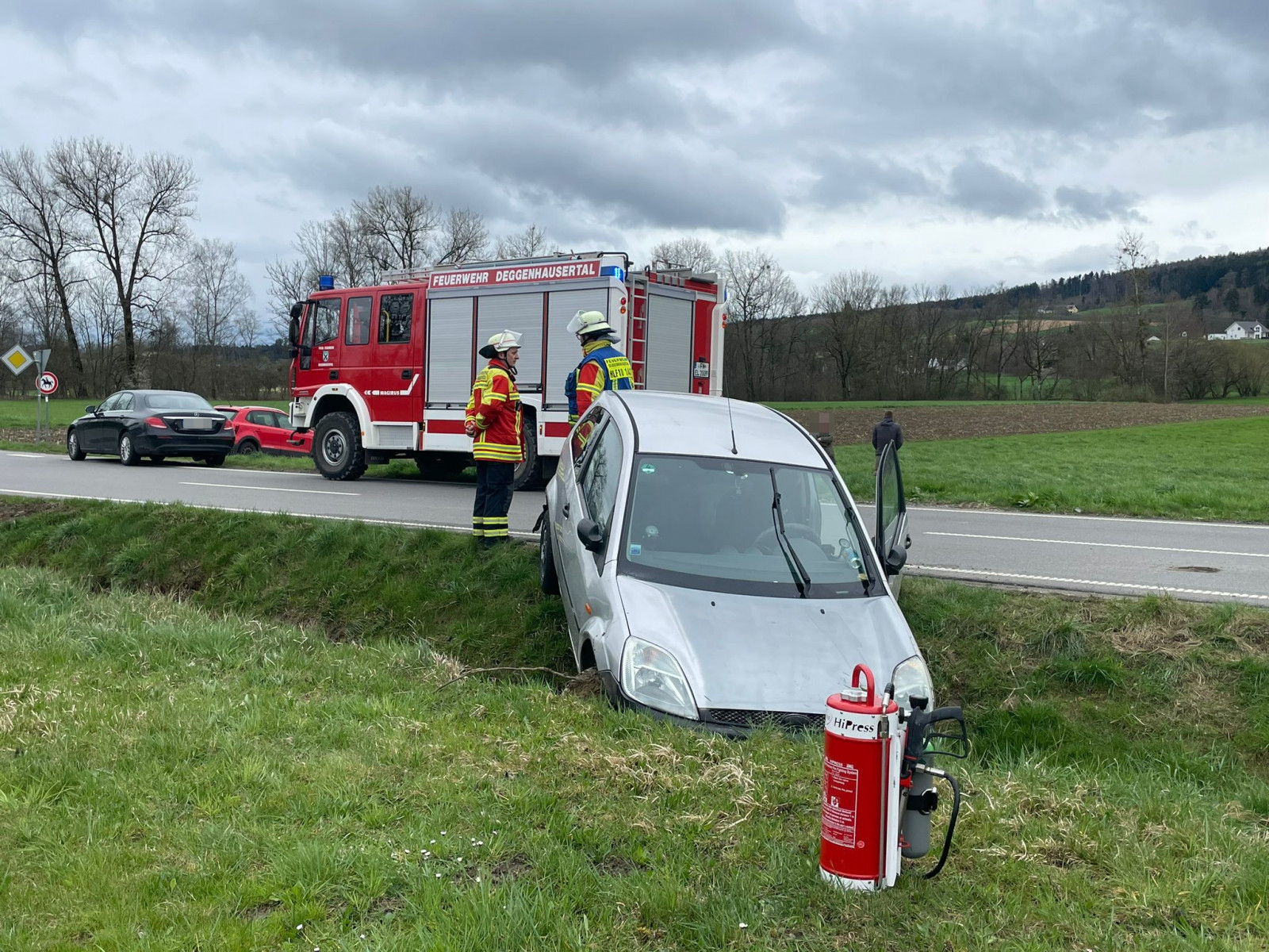 Wir wurden zu einem Verkehrsunfall auf der L204 bei Urnau alarmiert. Dort war ein PKW von der Fahrbahn abgekommen und in den, parallel zur Straße verlaufenden, Graben gefahren.
