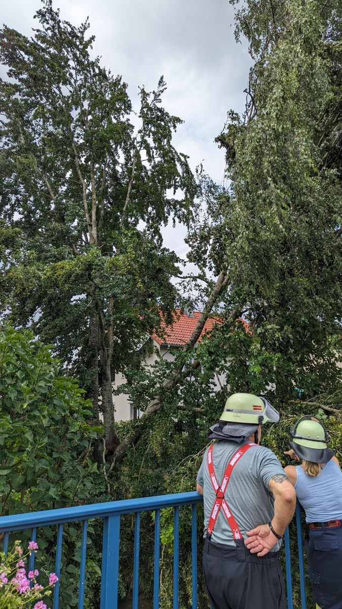 Die Freiwillige Feuerwehr Deggenhausertal wurde durch die Leitstelle nach Untersiggingen alarmiert. Dort sollte das Regierungspräsidium unterstützt werden einen Baum zu sichern, welcher auf eine Brücke mit Fußgängerüberweg zu stürzen drohte.