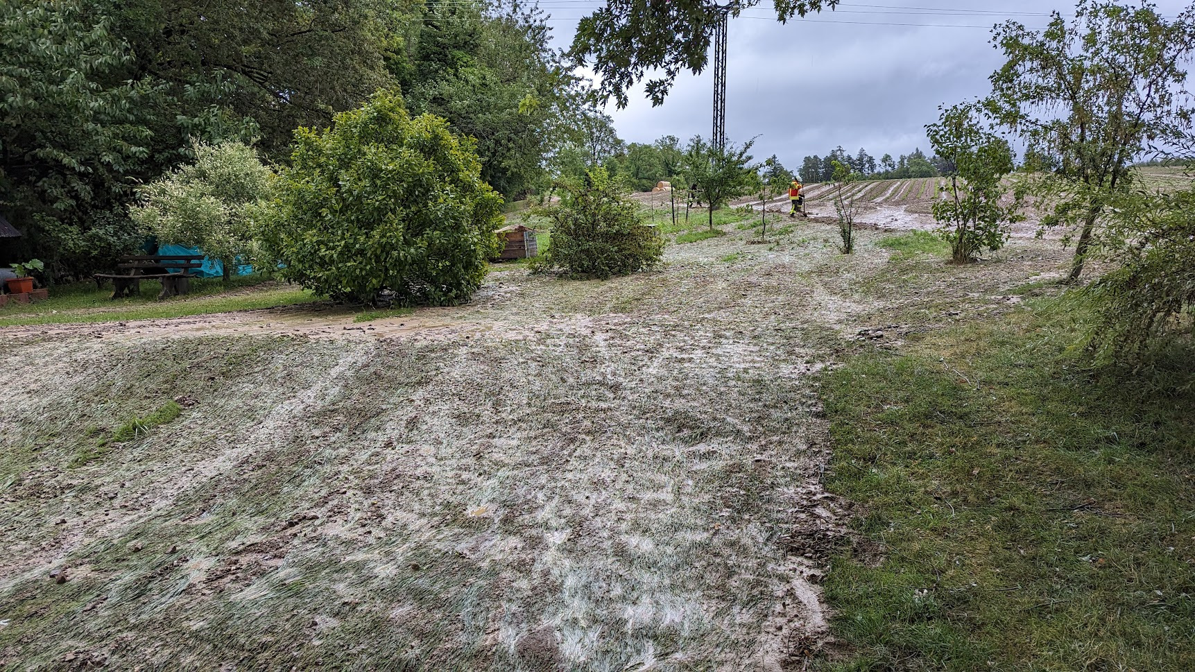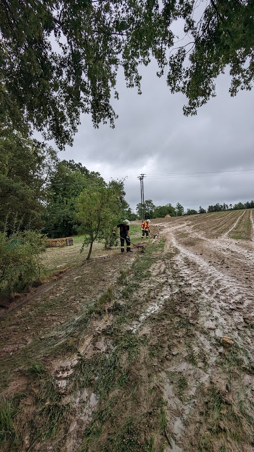 In Harresheim lief Wasser über einen Acker in den Keller eines Anwesens. Die Freiwillige Feuerwehr Deggenhausertal half beim Stoppen und Umleiten des Wassers. Dazu wurden Gräben gezogen, Ablaufschächte geräumt und Sandsäcke angebracht.
