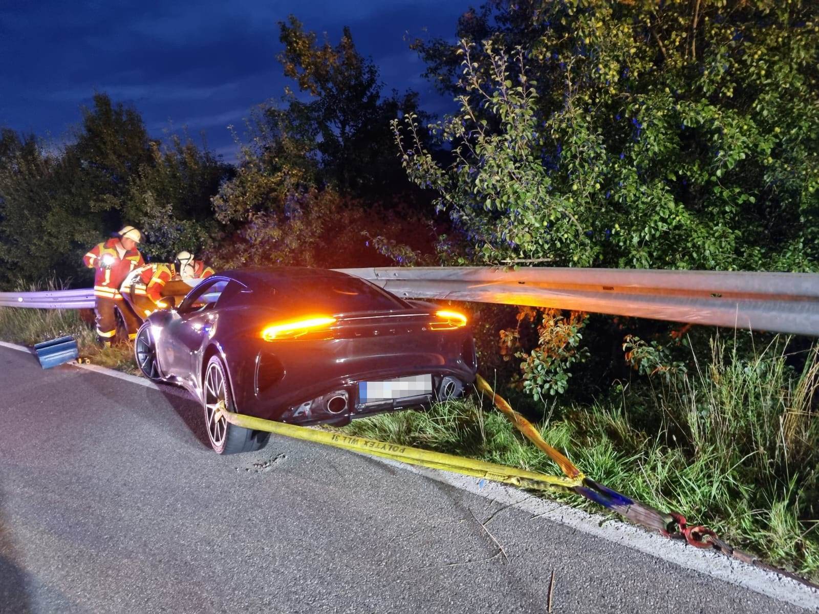 An der Unfallstelle stellte sich heraus, dass sich ein Sportwagen so unter der Leitplanke festgefahren hatte, dass der Abschleppdienst den Wagen nicht ohne Unterstützung bergen konnte. Die Feuerwehr demontierte daraufhin die Leitplanke, um dem Abschleppfahrzeug den Zugang zum Fahrzeug zu ermöglichen. Nachdem der Sportwagen erfolgreich geborgen war, wurde die Leitplanke provisorisch befestigt und die Straßenmeisterei informiert, um die endgültige Reparatur durchzuführen.