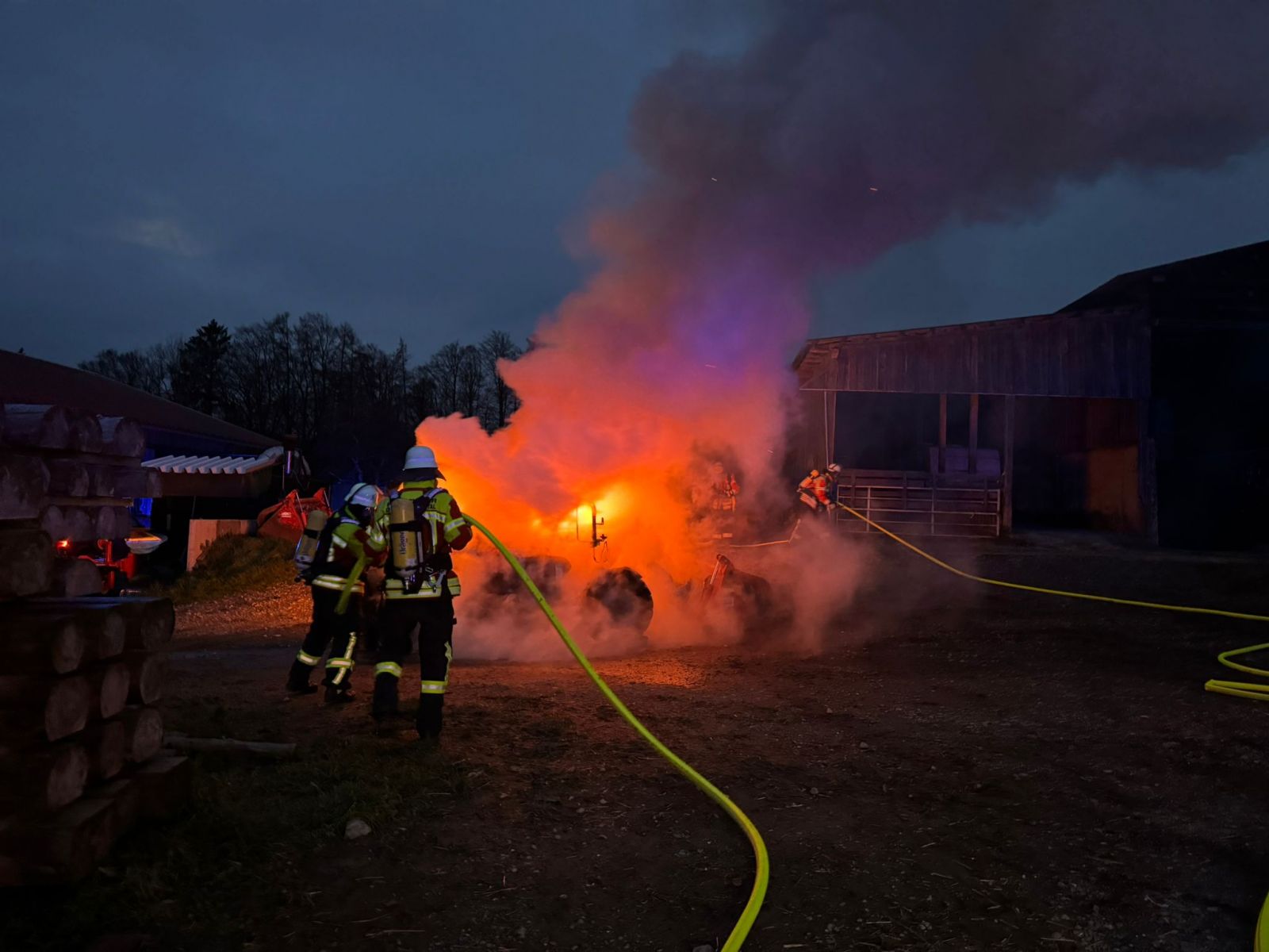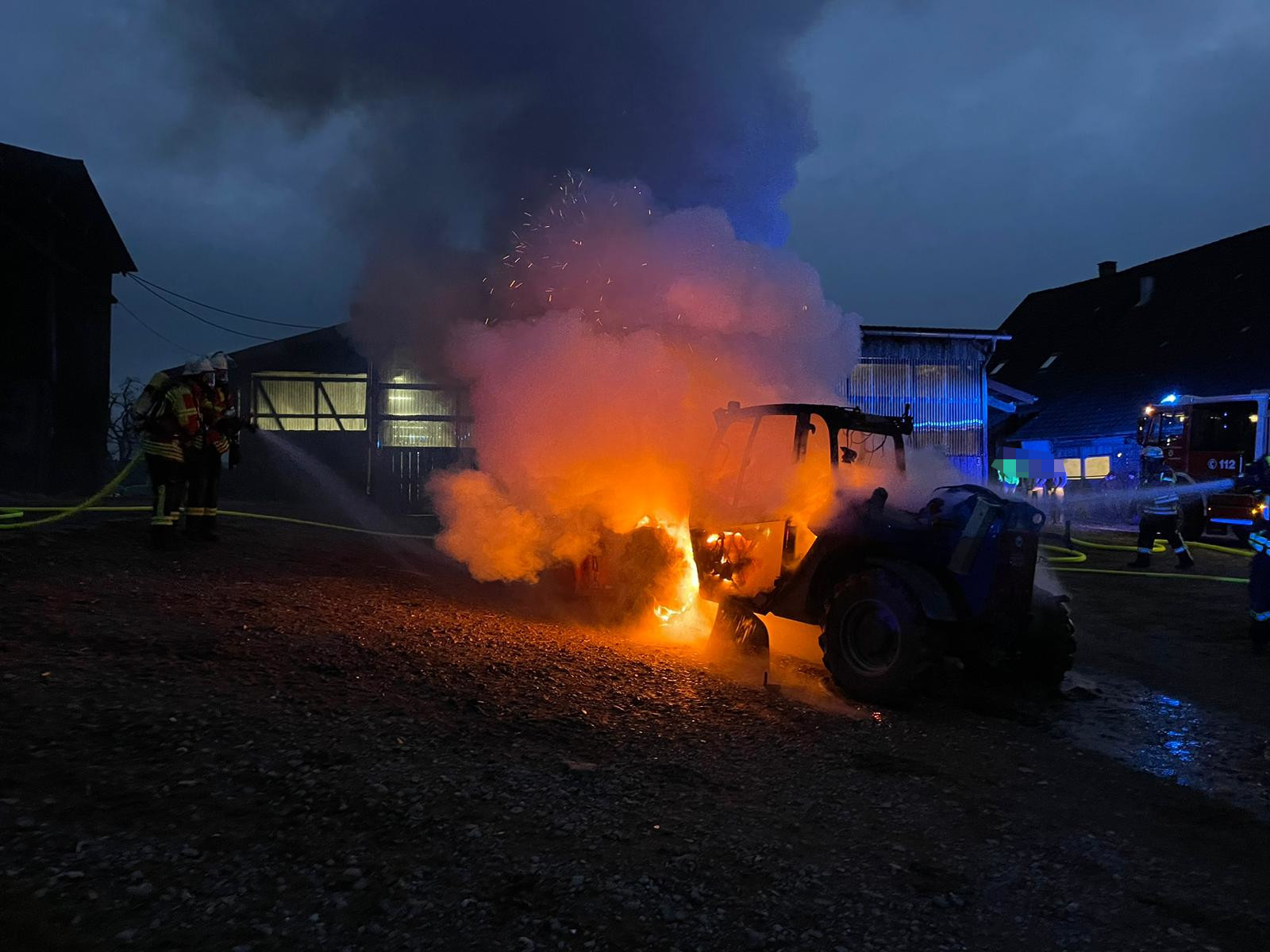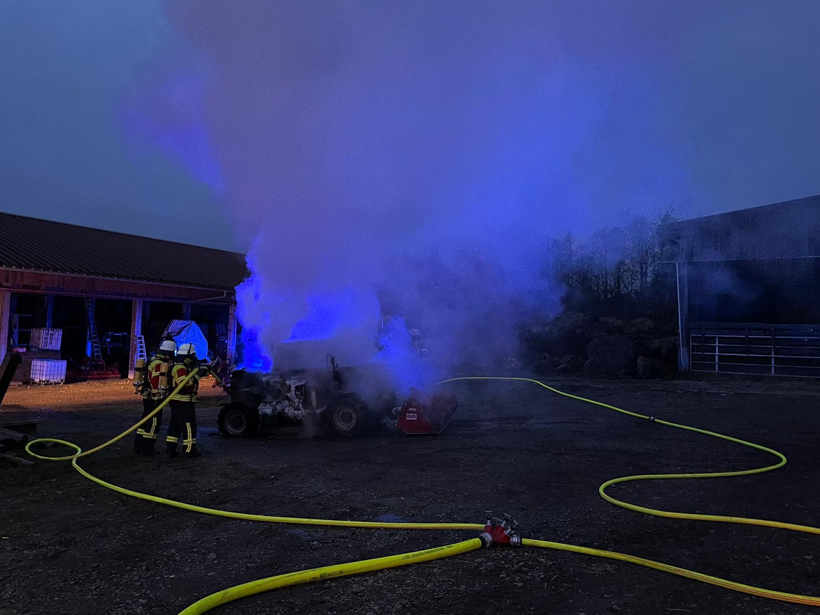 Dank des schnellen und überlegten Handelns des Besitzers konnte der Radlader rechtzeitig von den umliegenden Gebäuden entfernt und somit ein Übergreifen der Flammen verhindert werden. Beim Eintreffen der Feuerwehr stand das Fahrzeug jedoch bereits in Vollbrand.