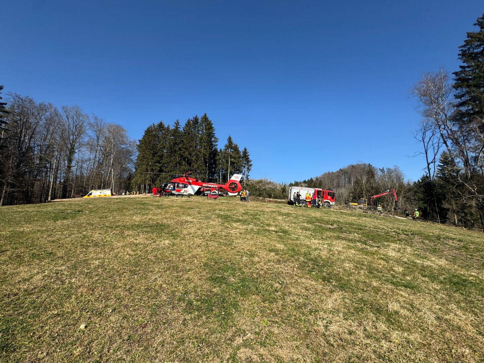 Zusätzlich waren der Rettungshubschrauber Christoph 45, ein Rettungswagen (RTW) sowie die Polizei am Unfallort im Einsatz. Der Patient wurde schließlich vom Hubschrauber ins Krankenhaus transportiert.