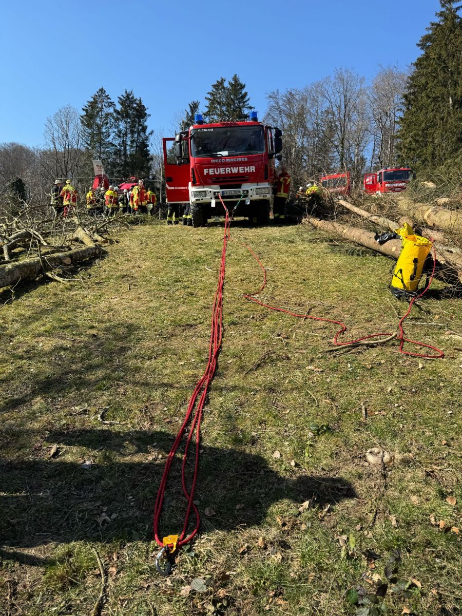 Die Einsatzkräfte trafen schnell am Unfallort ein und begannen umgehend mit den Rettungsmaßnahmen. Aufgrund der schwierigen Geländebedingungen war eine sorgfältige und koordinierte Rettung erforderlich, um den Verletzten sicher zu bergen und medizinische Hilfe zuzuführen. Mithilfe eines Flaschenzuges und der Schleifkorbtrage konnte der Patient schnell und sicher aus dem steilen Waldstück gerettet und dem Rettungsdienst übergeben werden.