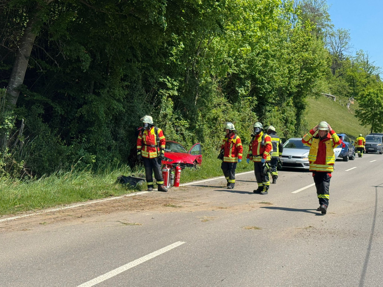 Am Samstagnachmittag wurde die Feuerwehr Deggenhausertal zu einem Verkehrsunfall auf der L204 im Bereich Fuchstobel bei Urnau alarmiert. Ein PKW war aus bislang unbekannter Ursache von der Fahrbahn abgekommen.