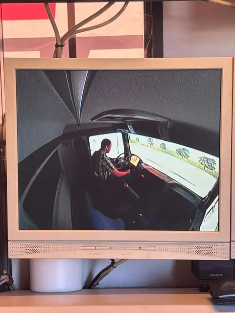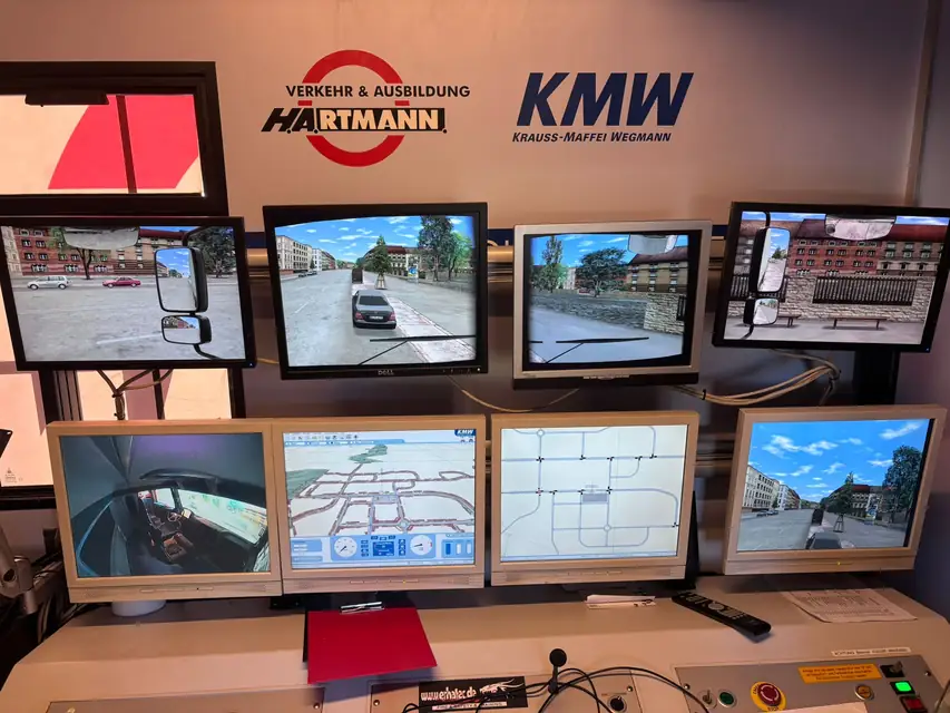 Anschließend ging es zur Praxis – und die hatte es in sich. Der Simulator befand sich in einem LKW-Auflieger und bestand aus einer voll funktionsfähigen MAN-Führerkabine, die ein äußerst realistisches Fahrgefühl vermittelte. Nach einer kurzen Eingewöhnungsphase, in der man sich mit der Technik vertraut machen konnte, begann das eigentliche Szenario: Blaulicht an, Sirene ein – Einsatzfahrt!