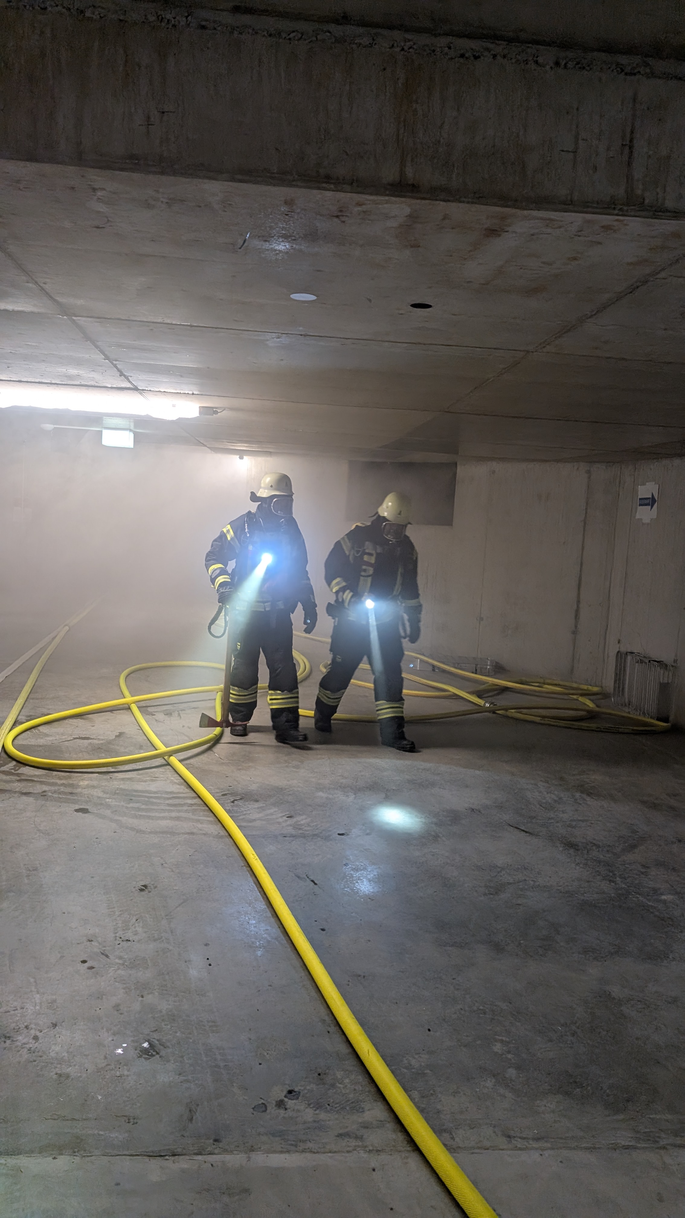 Die Einsatzkräfte reagierten umgehend mit der Erkundung der Tiefgarage. Diese wurde unter schwerem Atemschutz vorgenommen, um die Sicherheit der Einsatzkräfte in der potenziell gefährlichen Umgebung zu gewährleisten. Zur effizienten Durchsuchung der großflächigen Garage wurden Vierertrupps gebildet. Diese Taktik ermöglichte es, in kurzer Zeit eine möglichst große Fläche abzusuchen. Insgesamt kamen während der Übung zehn Trupps unter schwerem Atemschutz zum Einsatz.