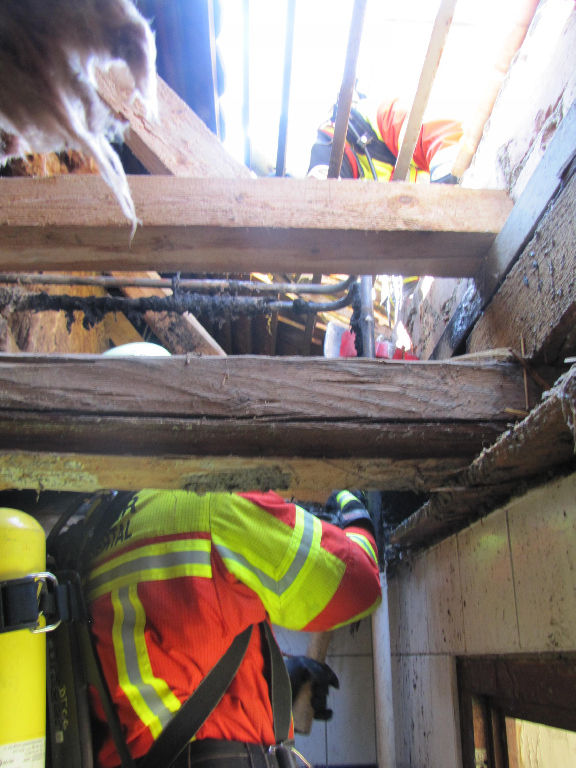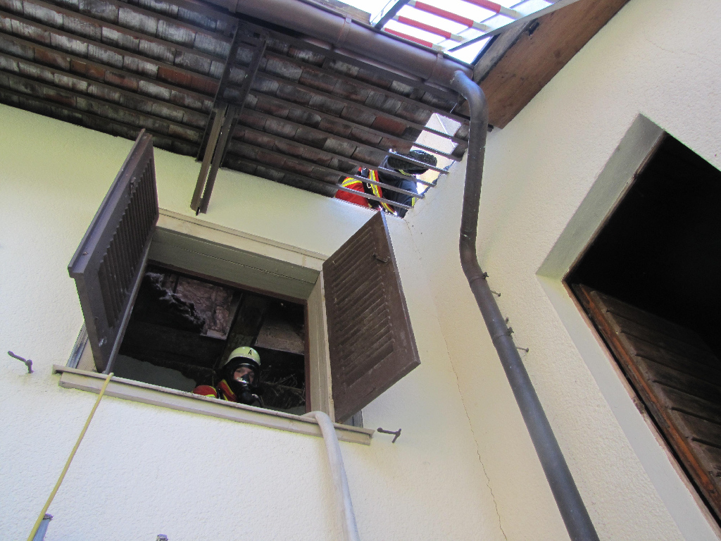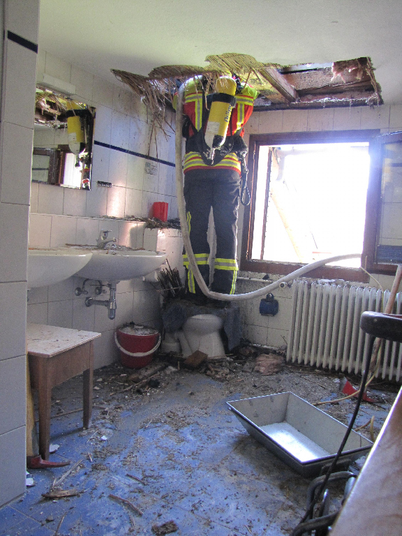 Parallel dazu wurde von außen das Dach geöffnet um weiter gegen die Glutnester vorzugehen zu können. Im weiteren Verlauf musste auch die Decke zum unteren Stockwerk geöffnet werden um Glutnester abzulöschen.