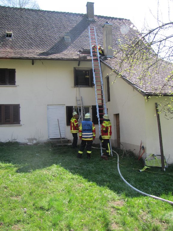 Vor Ort zeigte sich bereits leichter Rauch im Wohngebäude so dass die Erkundung unter schwerem Atemschutz durchgeführt werden musste. Bei der Erkundung wurde ein Feuer im Bereich der Zwischendecke in Richtung Dach festgestellt. Durch einen gezielten Löschangriff von innen konnte das Feuer eingedämmt werden.