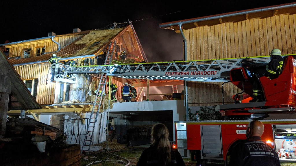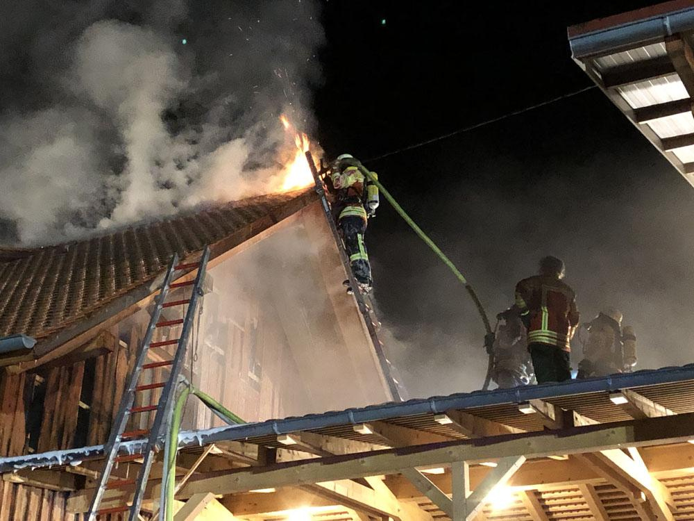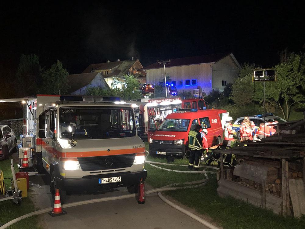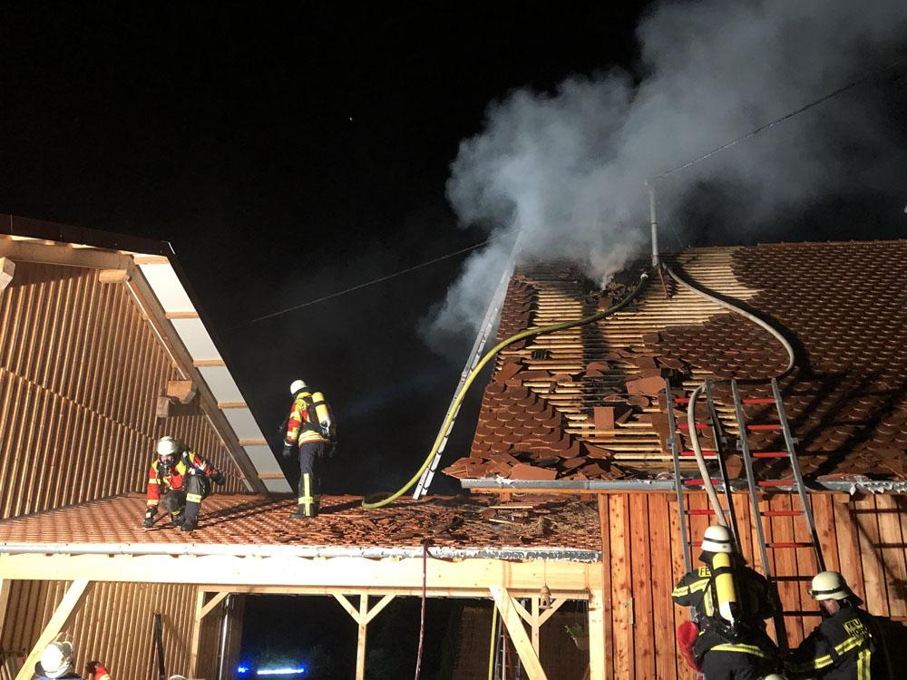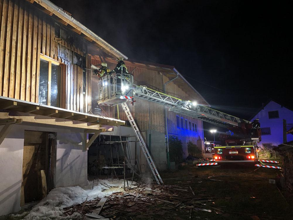 Deshalb wurde mithilfe der Drehleiter der Freiwilligen Feuerwehr Markdorf das Dach und die Schalung incl. Isolierung geöffnet und abgelöscht. Im weiteren Verlauf konnte das Feuer so immer mehr eingedämmt werden. Zur Unterstützung wurden die Feuerwehren Horgenzell ( 2 Löschfahrzeuge ), die Feuerwehr Markdorf ( Drehleiter, Tanklöschfahrzeug, Gerätewagen Atemschutz ) sowie die Feuerwehr Oberteuringen ( 2 Löschfahrzeuge ) nachgefordert. Insgesamt waren mehr als 100 Feuerwehrkameraden sowie 14 Kollegen des DRK vor Ort.