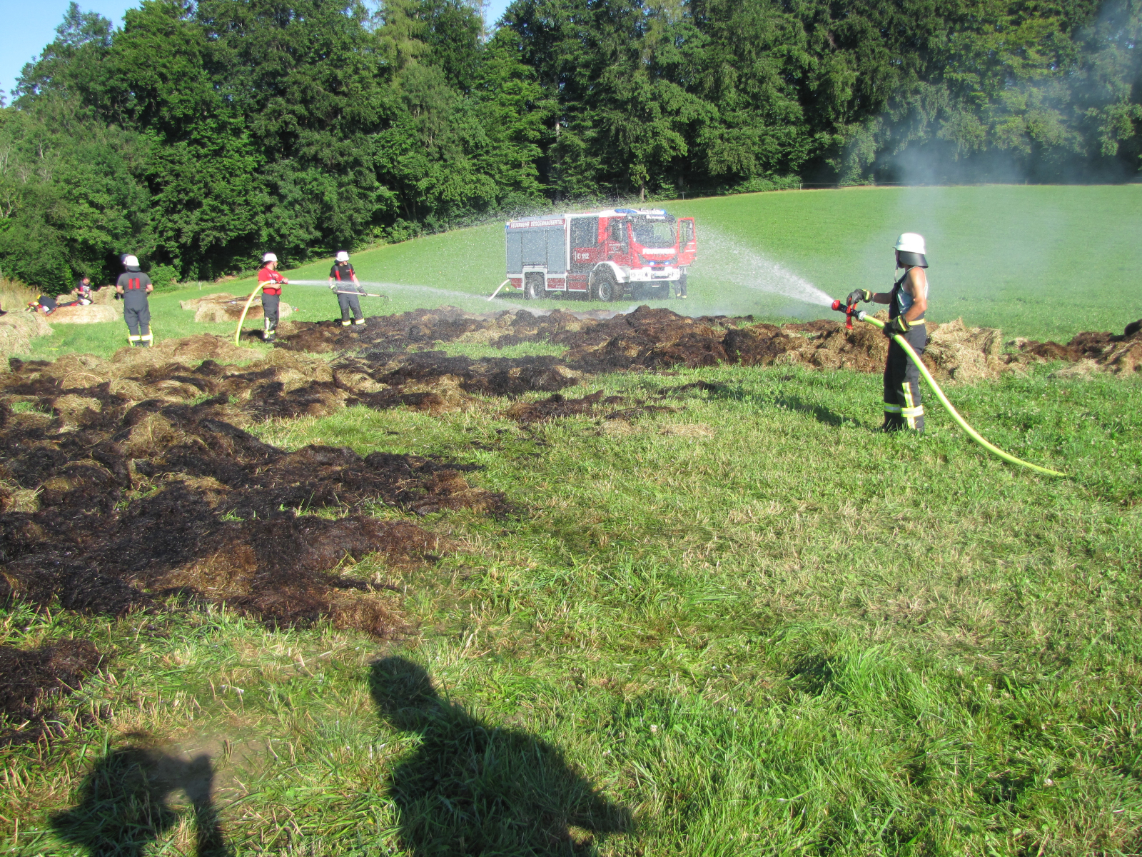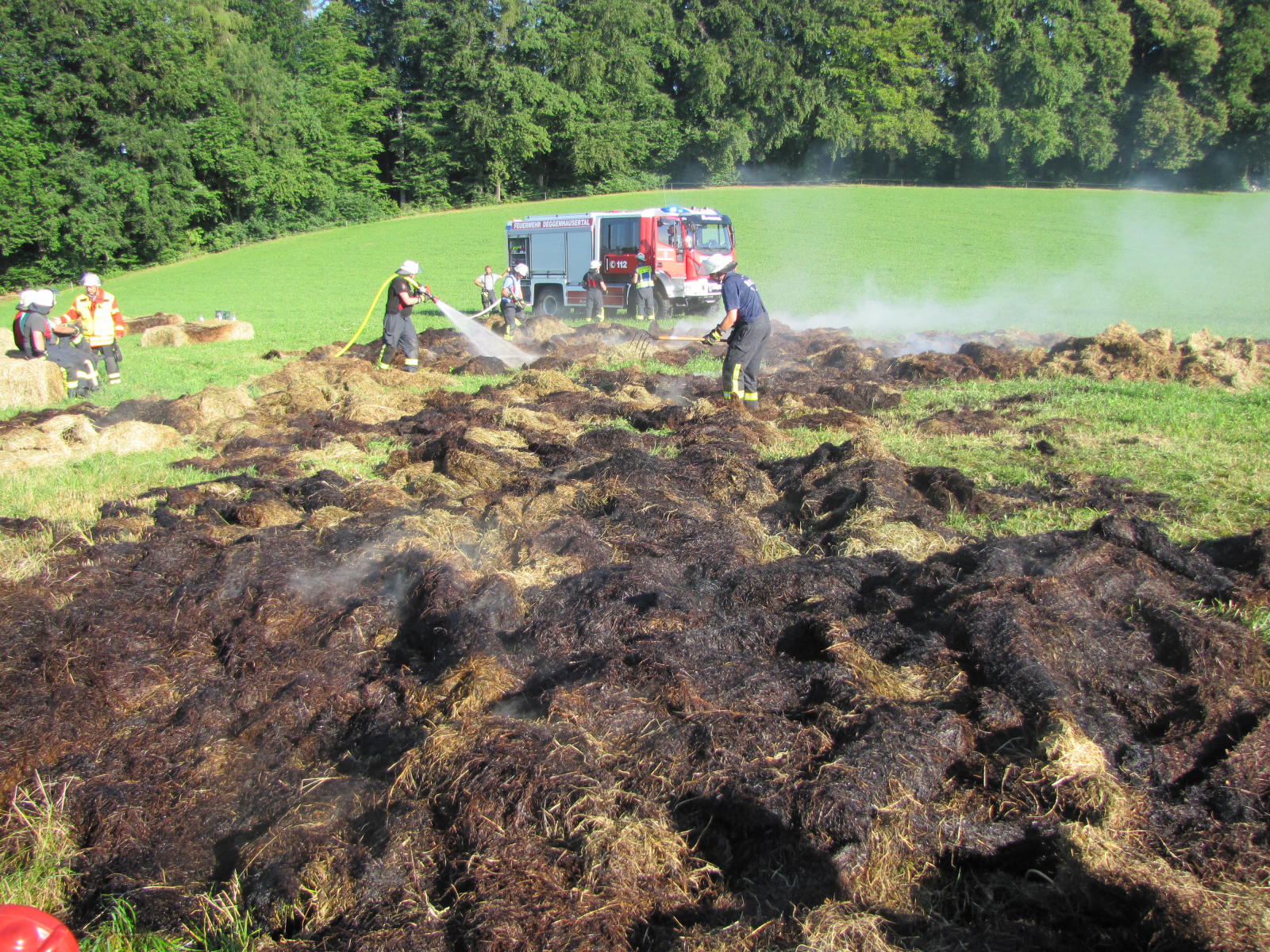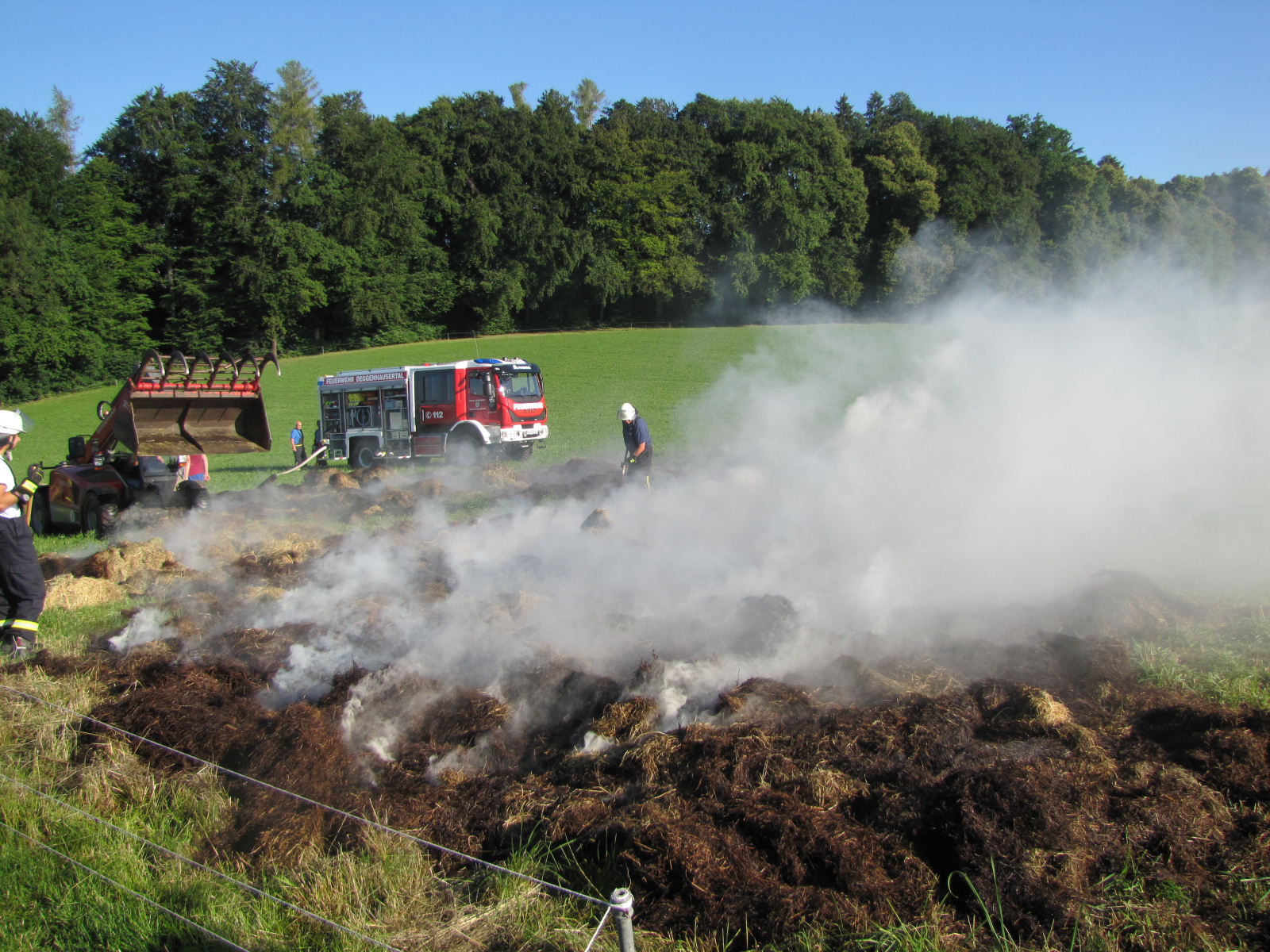 Vor Ort zeigte sich, dass Heuballen in einem überdachten Heulager glimmten. Mit Hilfe der Eigentümer wurden die Heuballen mittels Teleskoplader aus dem Lager entfernt und auf offener Fläche geöffnet und mit mehrere Röhren abgelöscht.