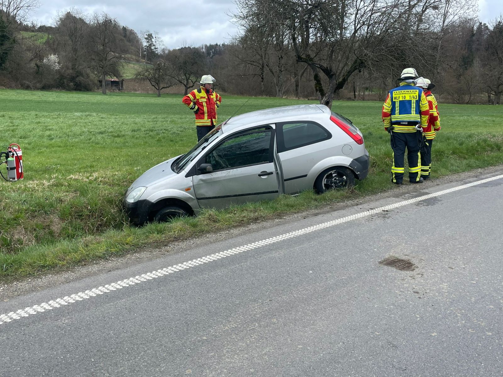 Wir wurden zu einem Verkehrsunfall auf der L204 bei Urnau alarmiert. Dort war ein PKW von der Fahrbahn abgekommen und in den, parallel zur Straße verlaufenden, Graben gefahren.