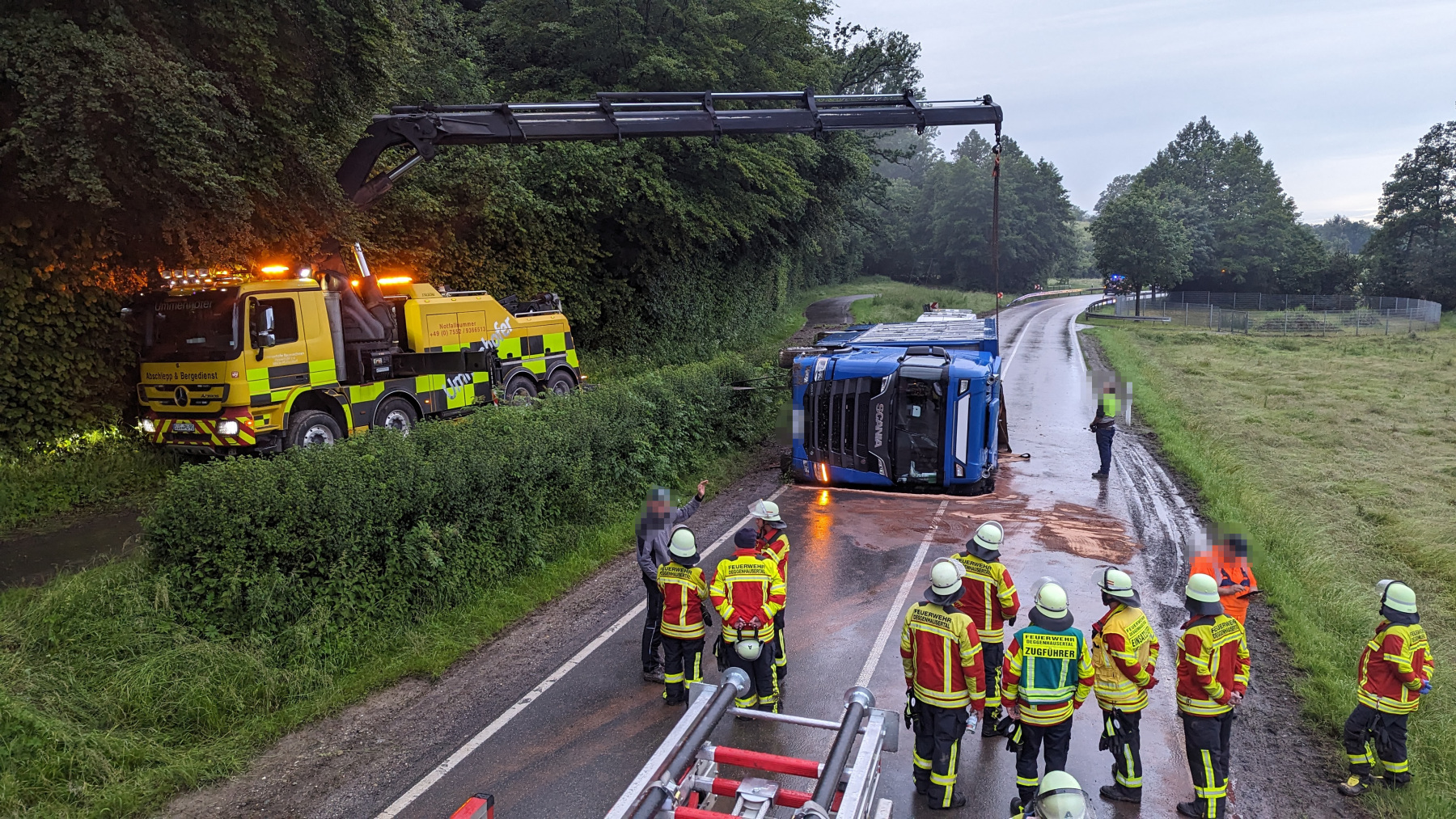 Beim Eintreffen der ersten Einsatzkräfte stellte sich heraus, dass ein LKW auf der Seite lag und der Fahrer eingeschlossen, jedoch nicht eingeklemmt war. Sofort wurde eine Rettung mithilfe von Steckleitern eingeleitet, um den Fahrer schnell zu befreien. Parallel dazu wurden auslaufende Betriebsstoffe aufgefangen, um eine Umweltgefährdung zu verhindern, und der Brandschutz sichergestellt.
