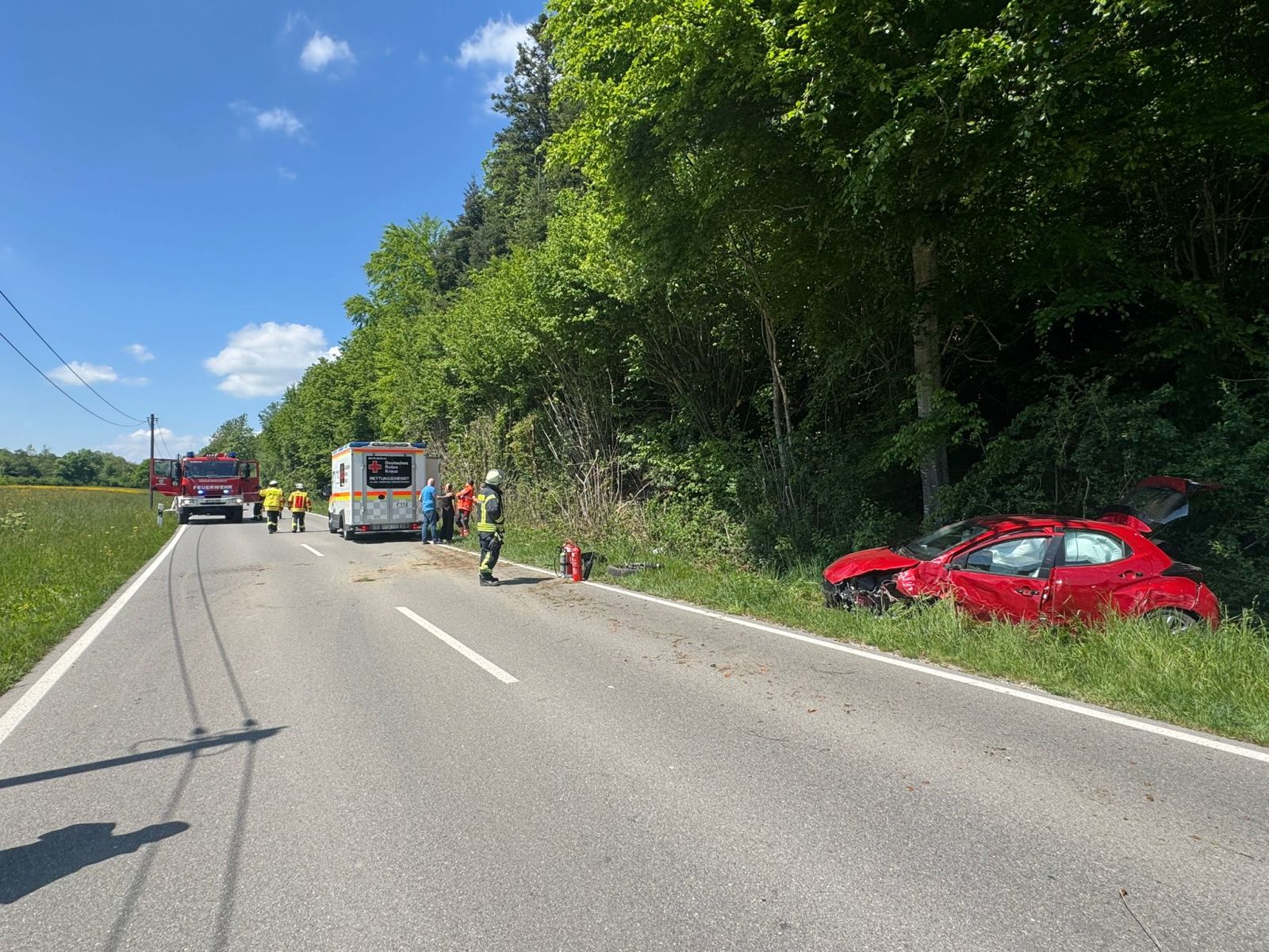 Am Samstagnachmittag wurde die Feuerwehr Deggenhausertal zu einem Verkehrsunfall auf der L204 im Bereich Fuchstobel bei Urnau alarmiert. Ein PKW war aus bislang unbekannter Ursache von der Fahrbahn abgekommen.
