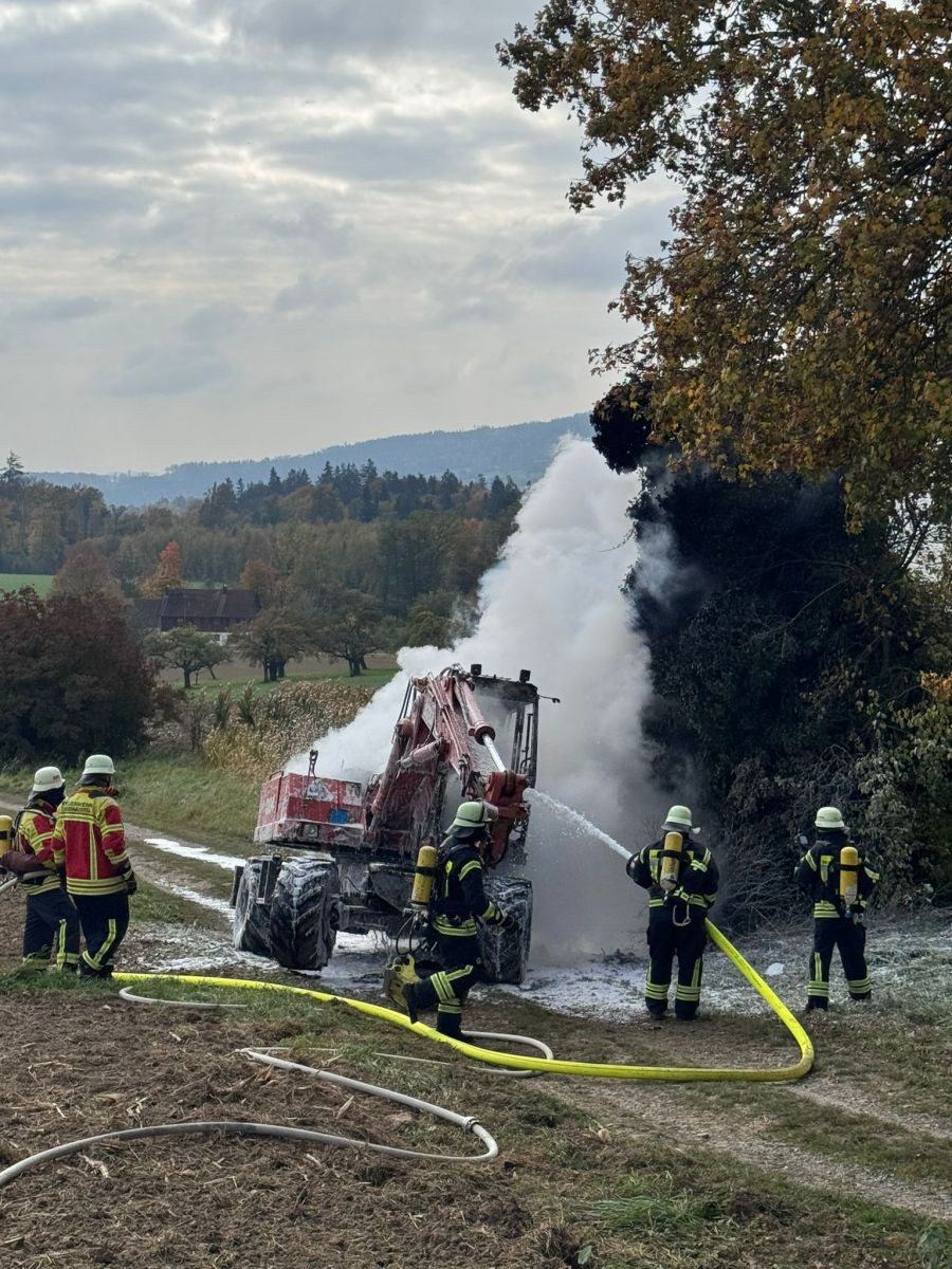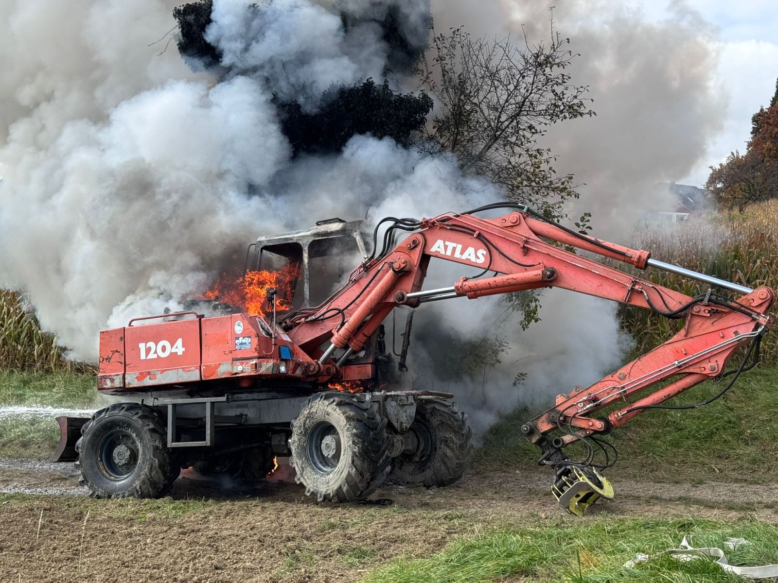 Am Freitag, 17. Oktober 2025, wurde die Freiwillige Feuerwehr Deggenhausertal gegen 11:25 Uhr nach Limpach alarmiert. Bereits auf der Anfahrt war eine deutliche Rauchwolke sichtbar. Vor Ort stand ein Bagger in Vollbrand – glücklicherweise nicht in der Nähe von Gebäuden.